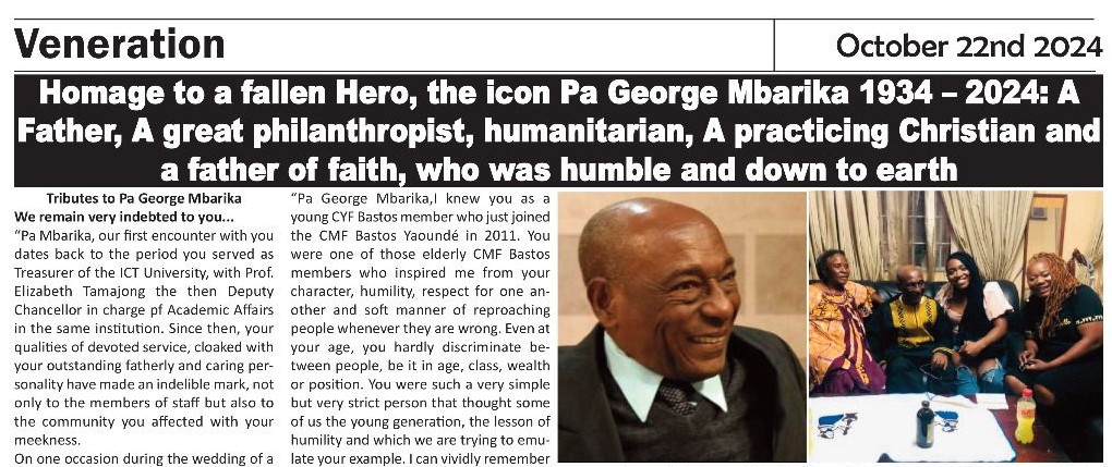 “Pa George Mbarika, I knew you as a young CYF Bastos member who just joined the CMF Bastos Yaoundé in 2011. You were one of those elderly CMF Bastos members who inspired me with your character, humility, respect for one another, and soft manner of reproaching people whenever they were wrong. Even at your age, you hardly discriminated between people, be it in age, class, wealth, or position. You were such a very simple but very strict person that taught some of us the young generation the lesson of humility, and which we are trying to emulate in your example.
